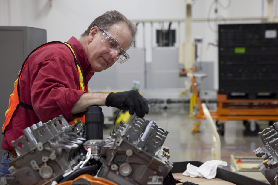 Рабочий на заводе двигателей Chrysler в Мичигане, Северная Америка